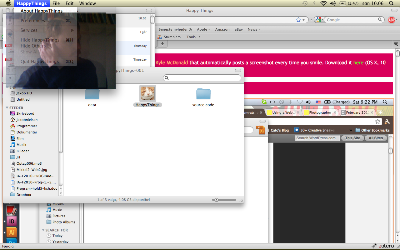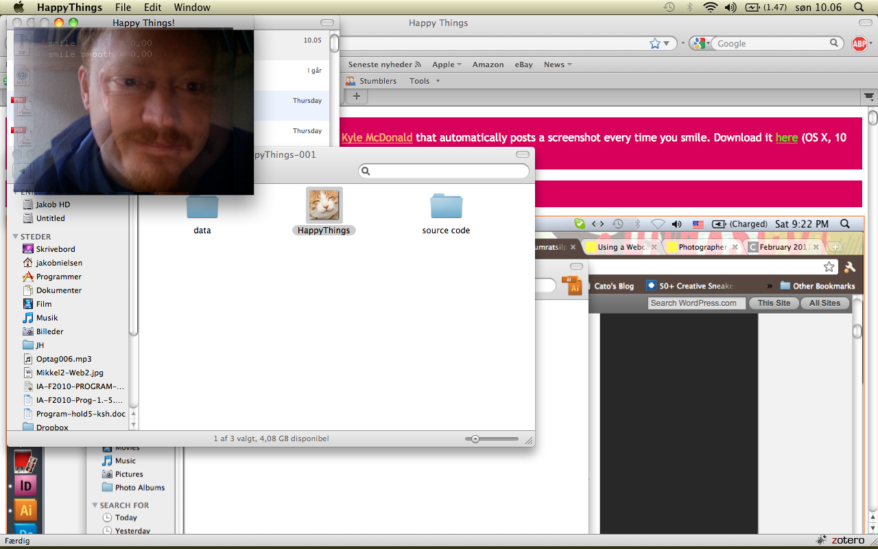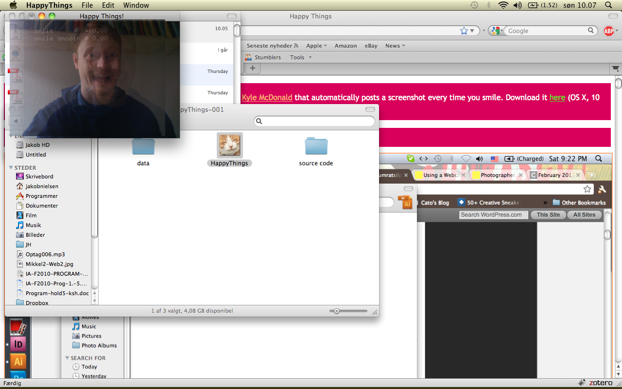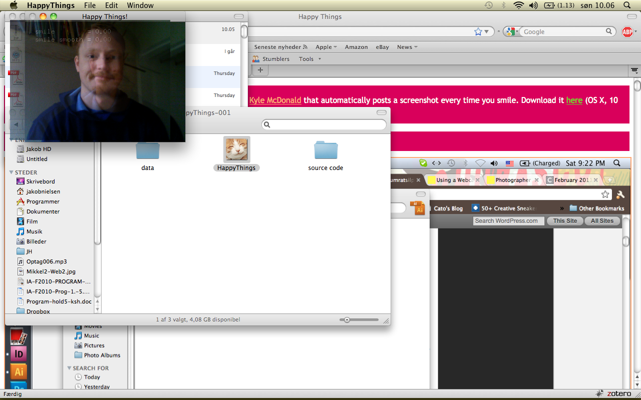 Happy Things is a one hour speed project by Theo Watson and Kyle McDonald that automatically posts a screenshot every time you smile. Download it here (OS X, 10 MB).