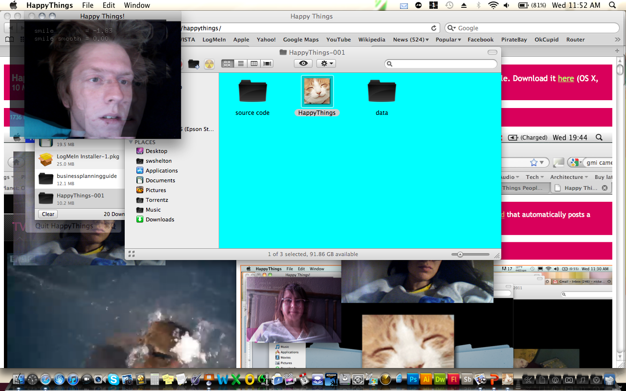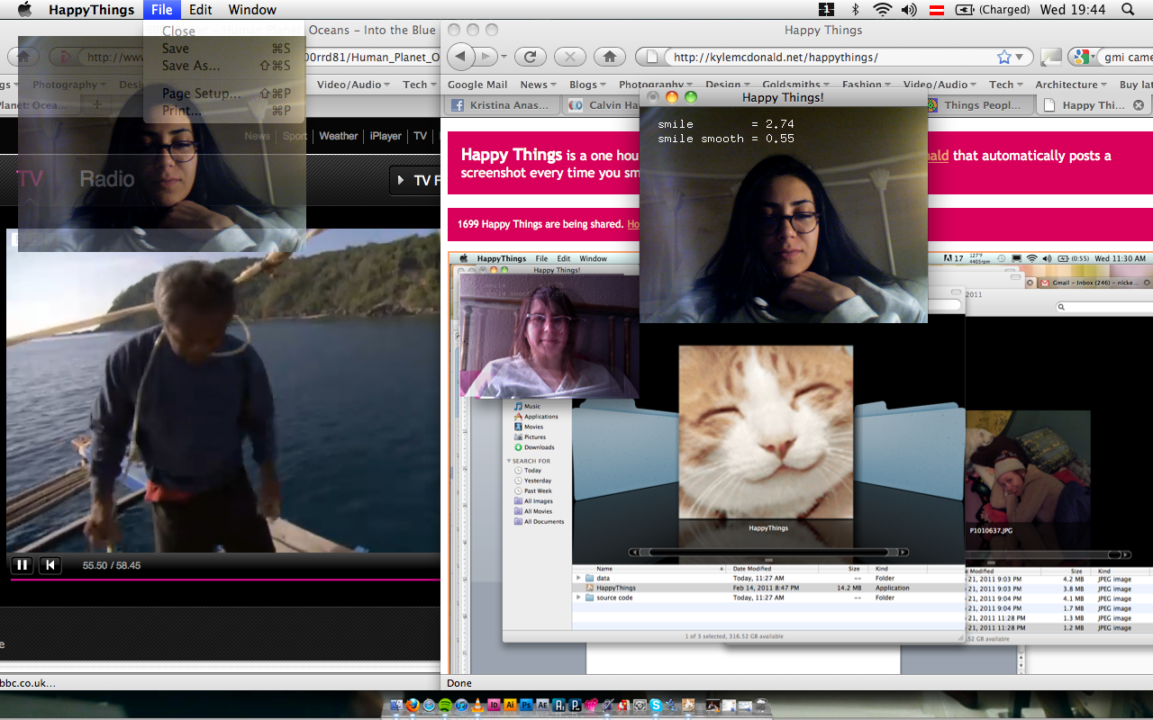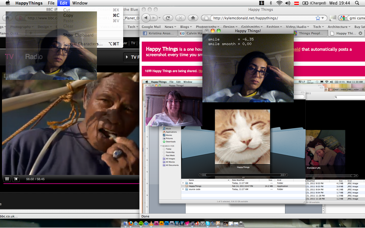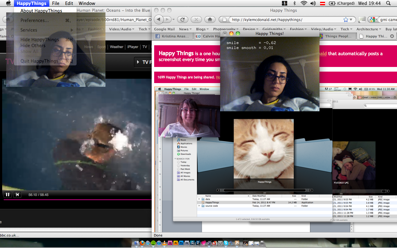 Happy Things is a one hour speed project by Theo Watson and Kyle McDonald that automatically posts a screenshot every time you smile. Download it here (OS X, 10 MB).
