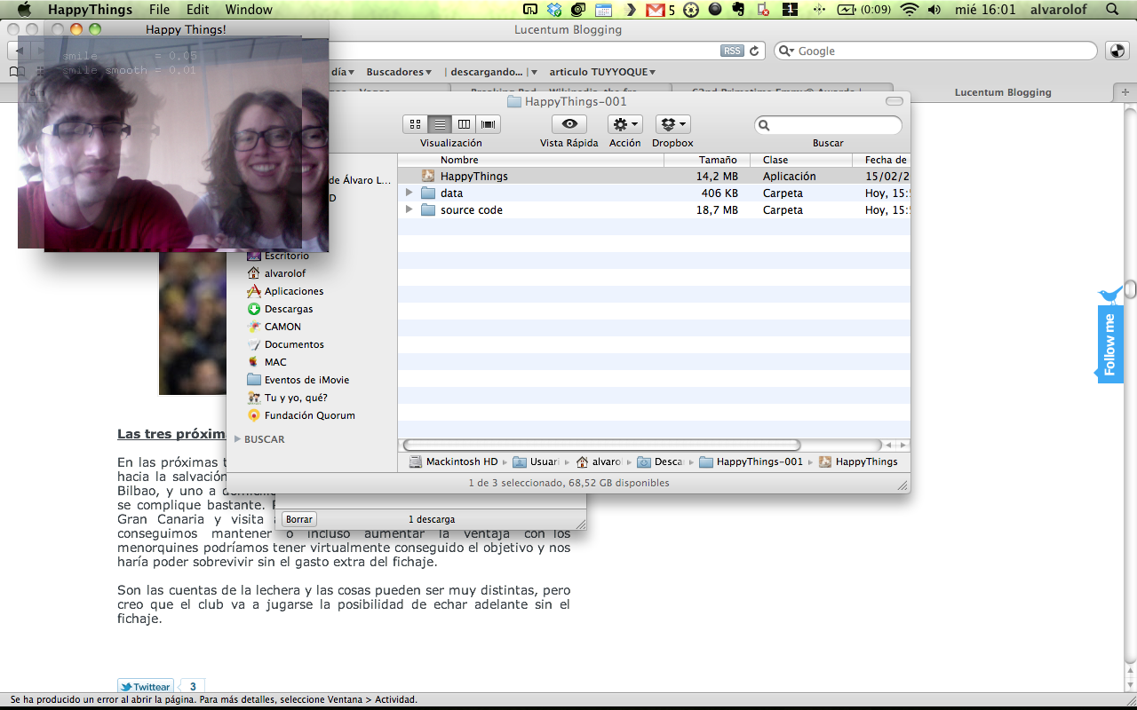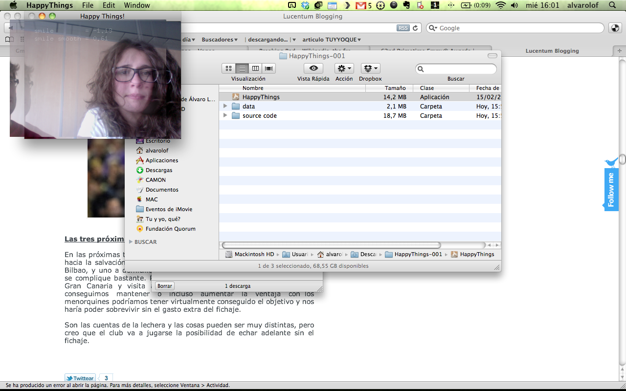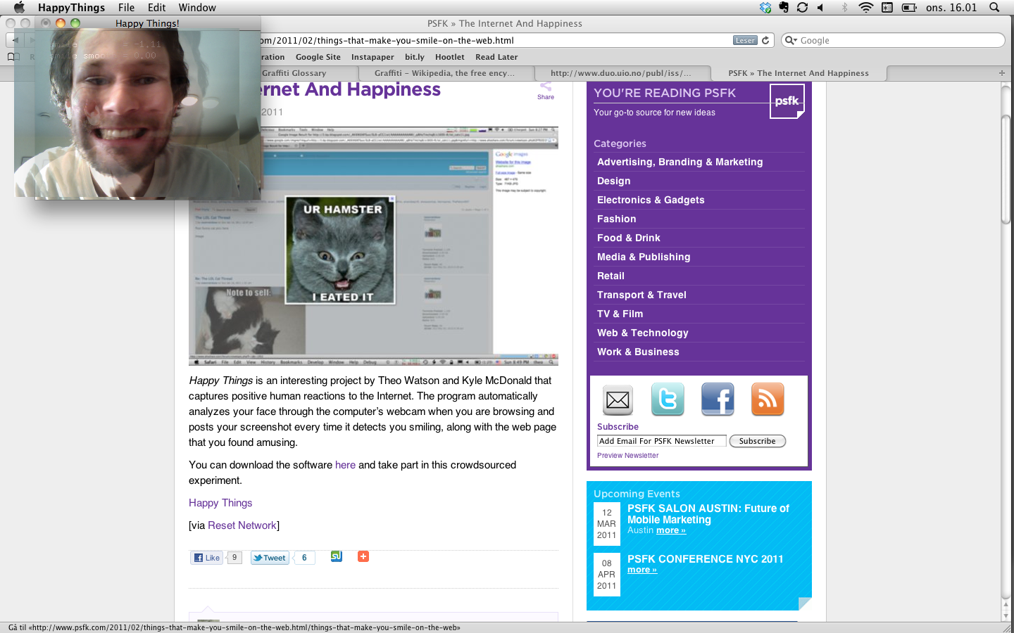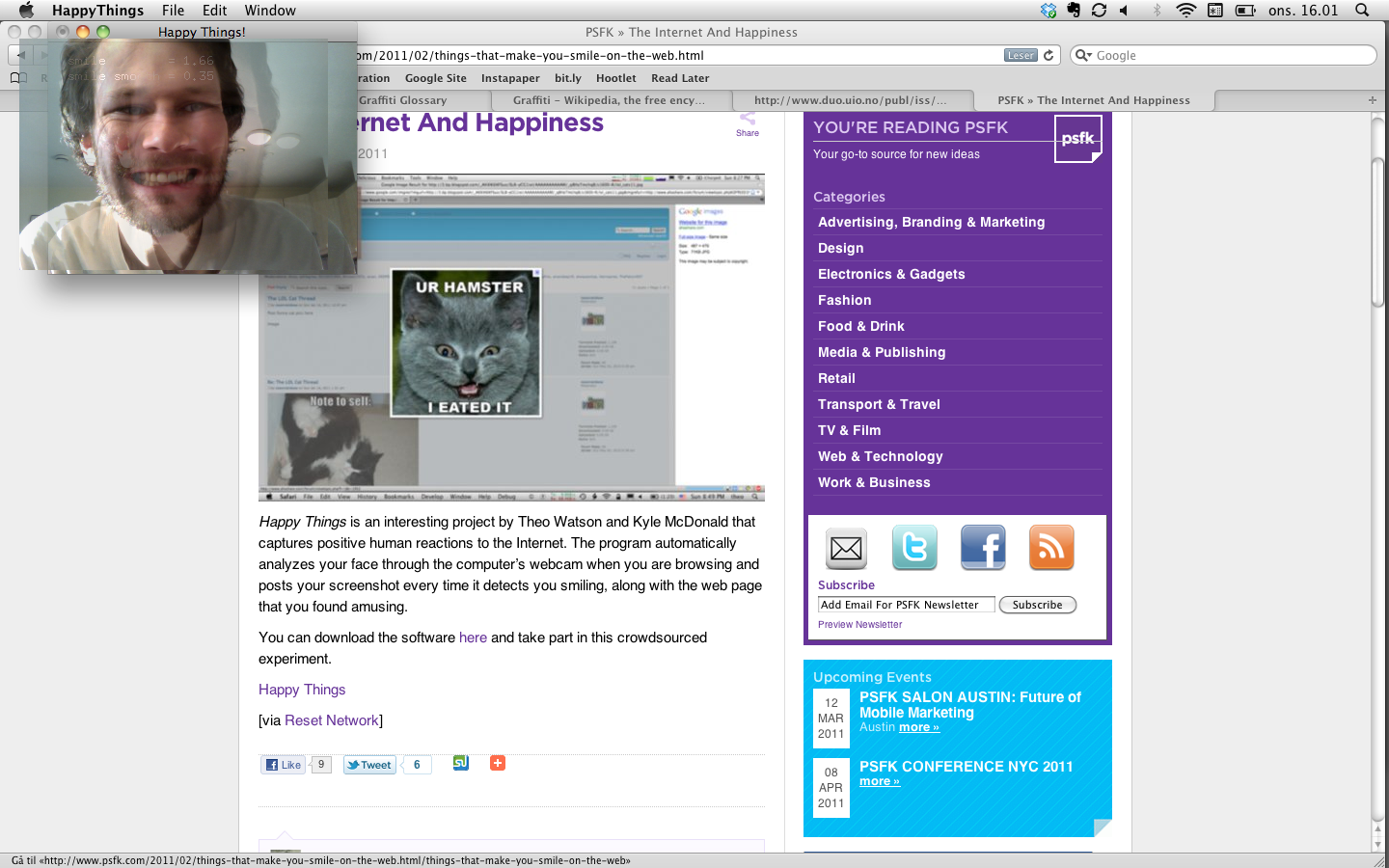 Happy Things is a one hour speed project by Theo Watson and Kyle McDonald that automatically posts a screenshot every time you smile. Download it here (OS X, 10 MB).