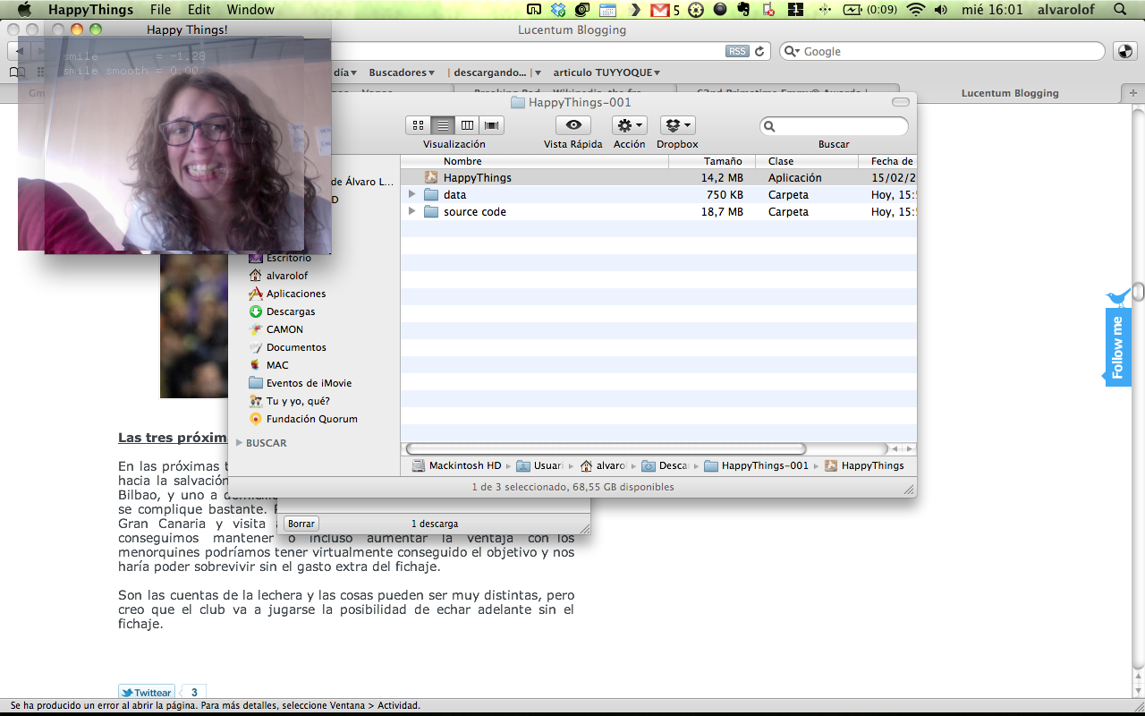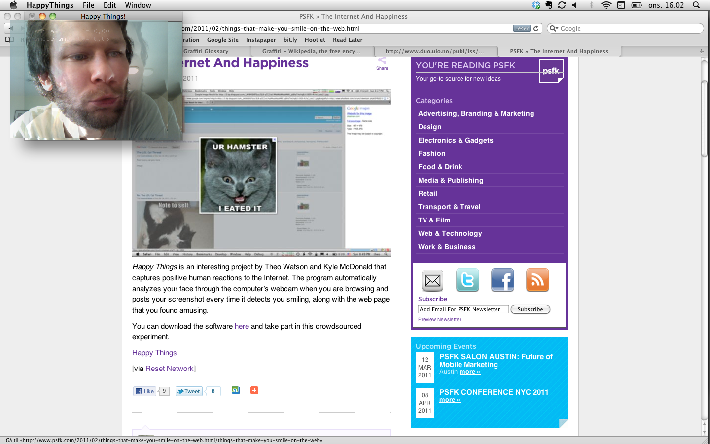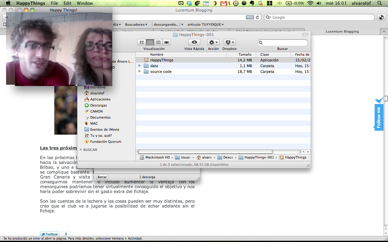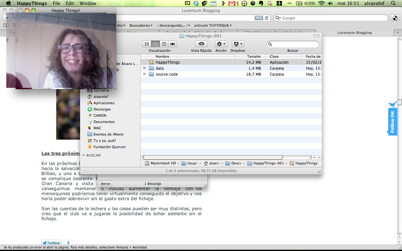 Happy Things is a one hour speed project by Theo Watson and Kyle McDonald that automatically posts a screenshot every time you smile. Download it here (OS X, 10 MB).