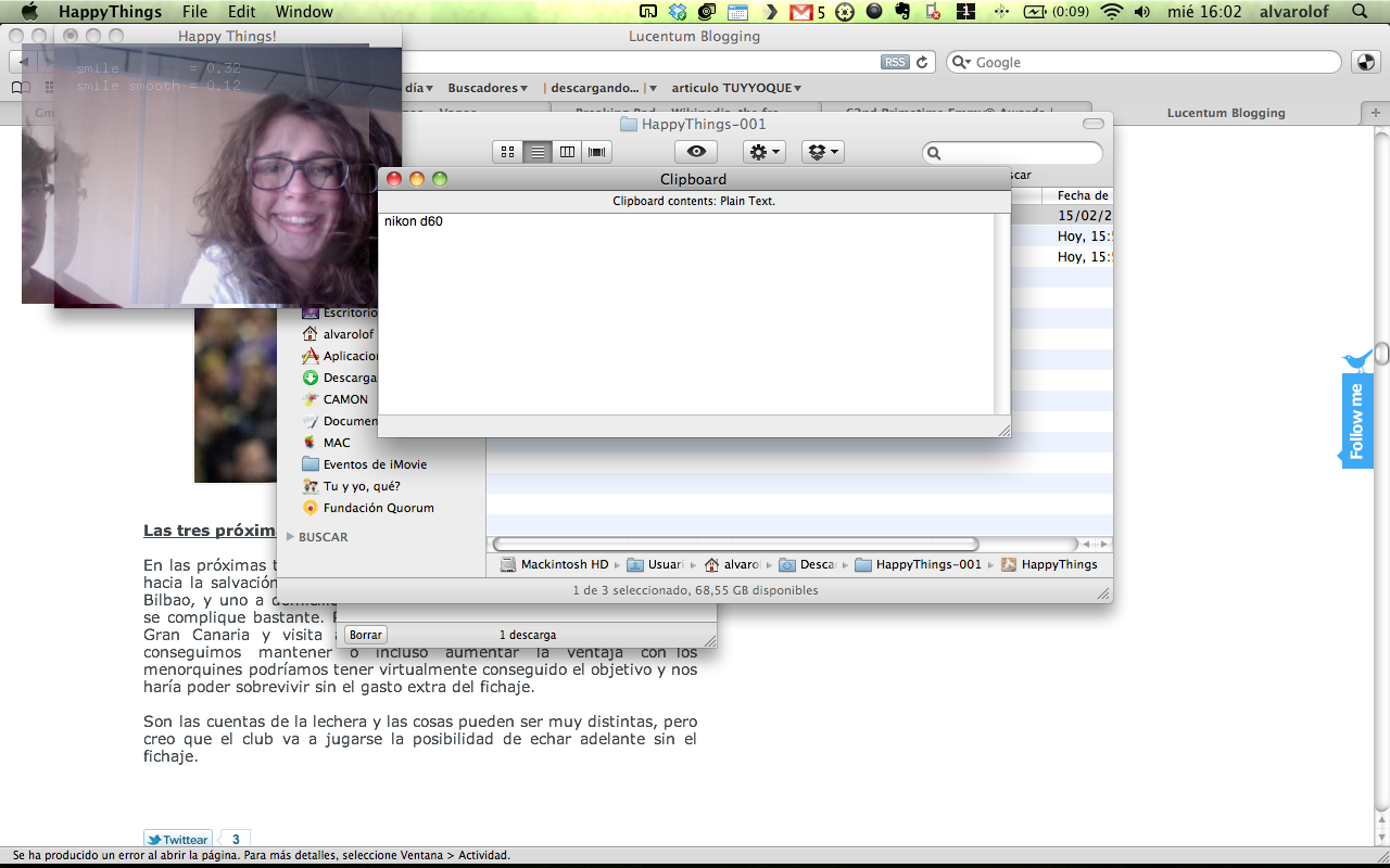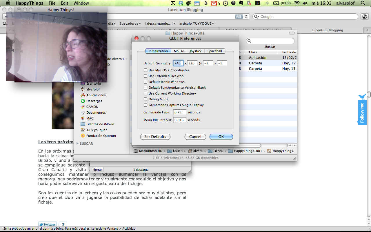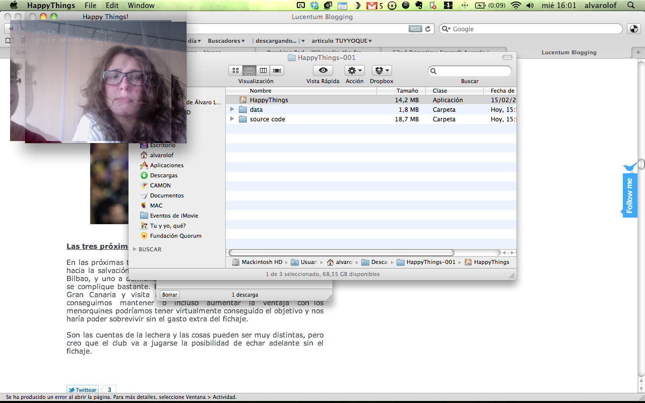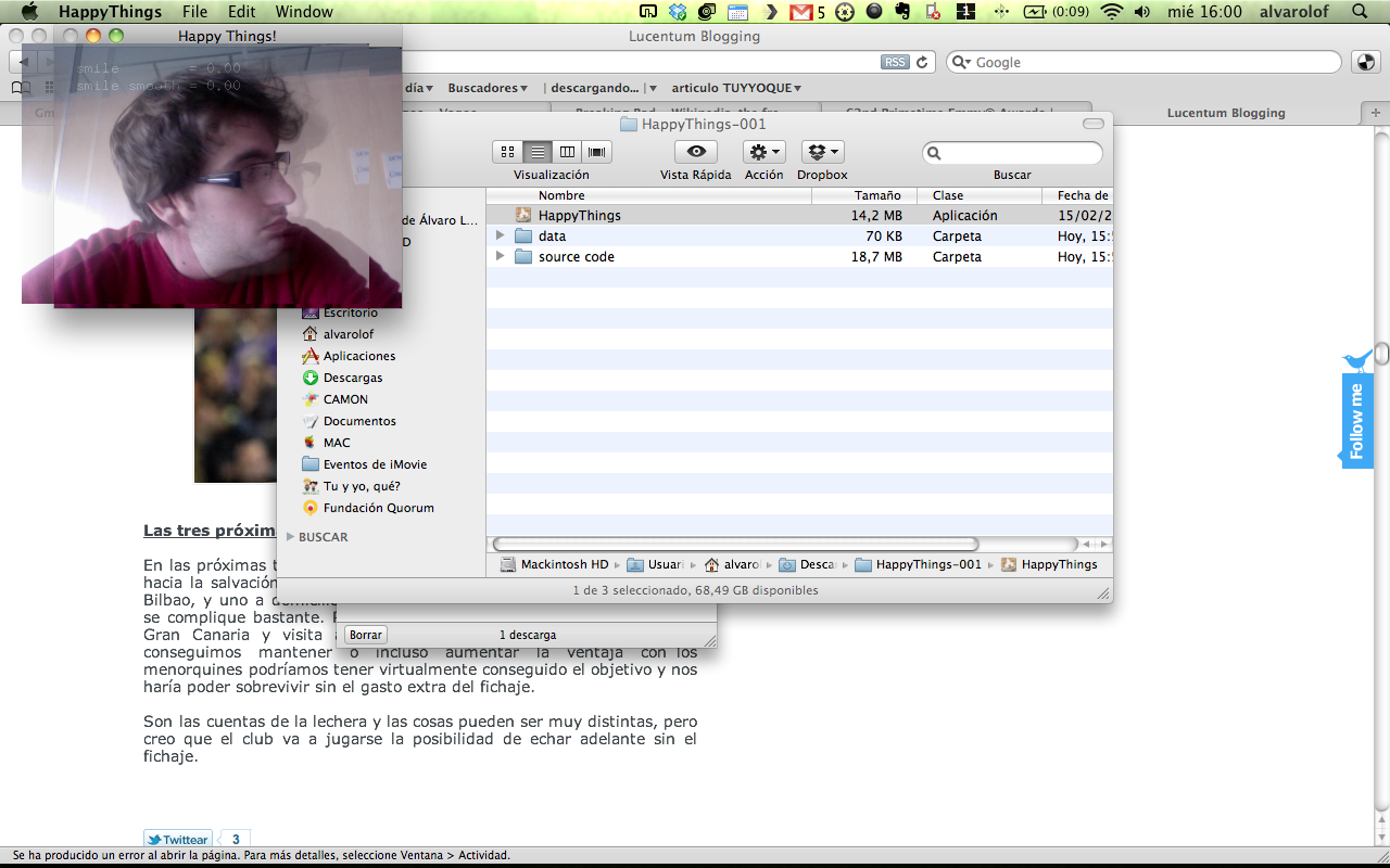 Happy Things is a one hour speed project by Theo Watson and Kyle McDonald that automatically posts a screenshot every time you smile. Download it here (OS X, 10 MB).