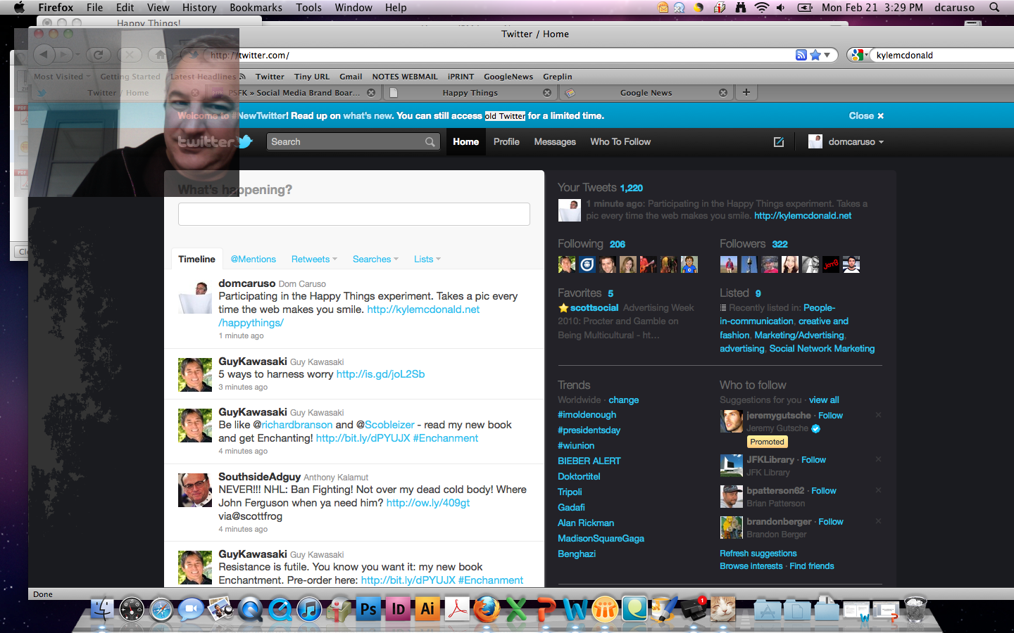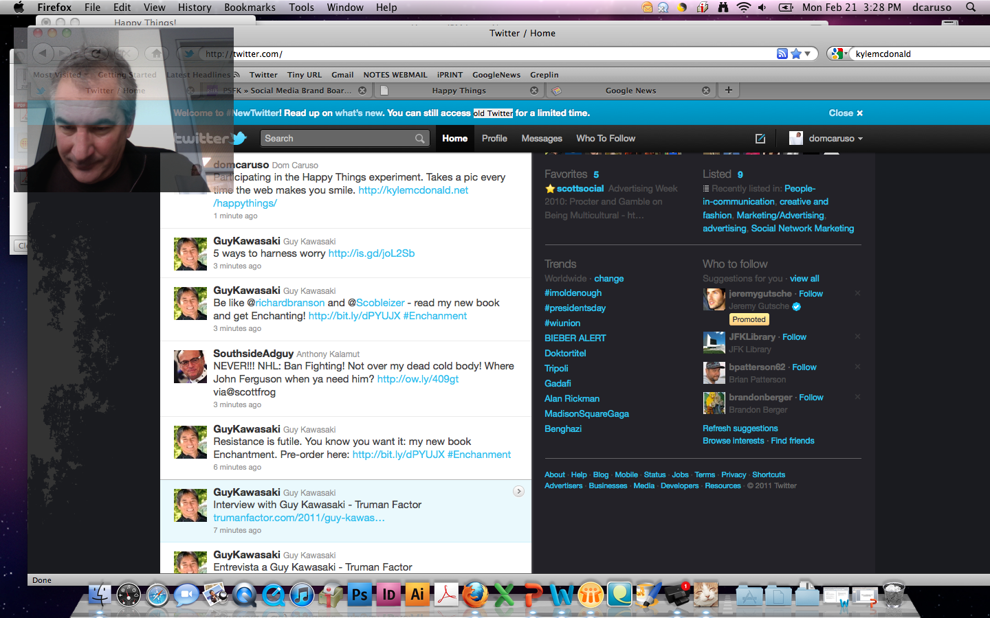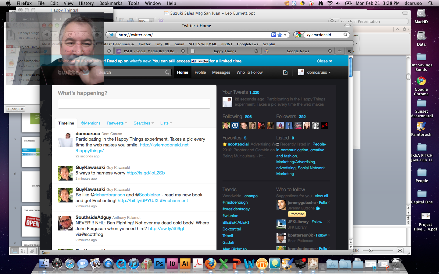 Happy Things is a one hour speed project by Theo Watson and Kyle McDonald that automatically posts a screenshot every time you smile. Download it here (OS X, 10 MB).