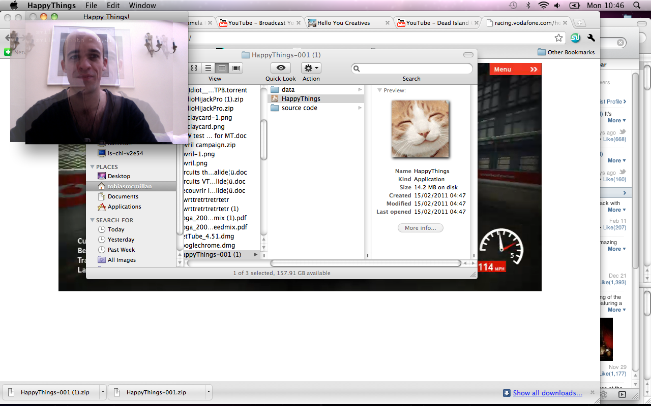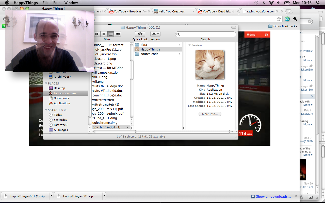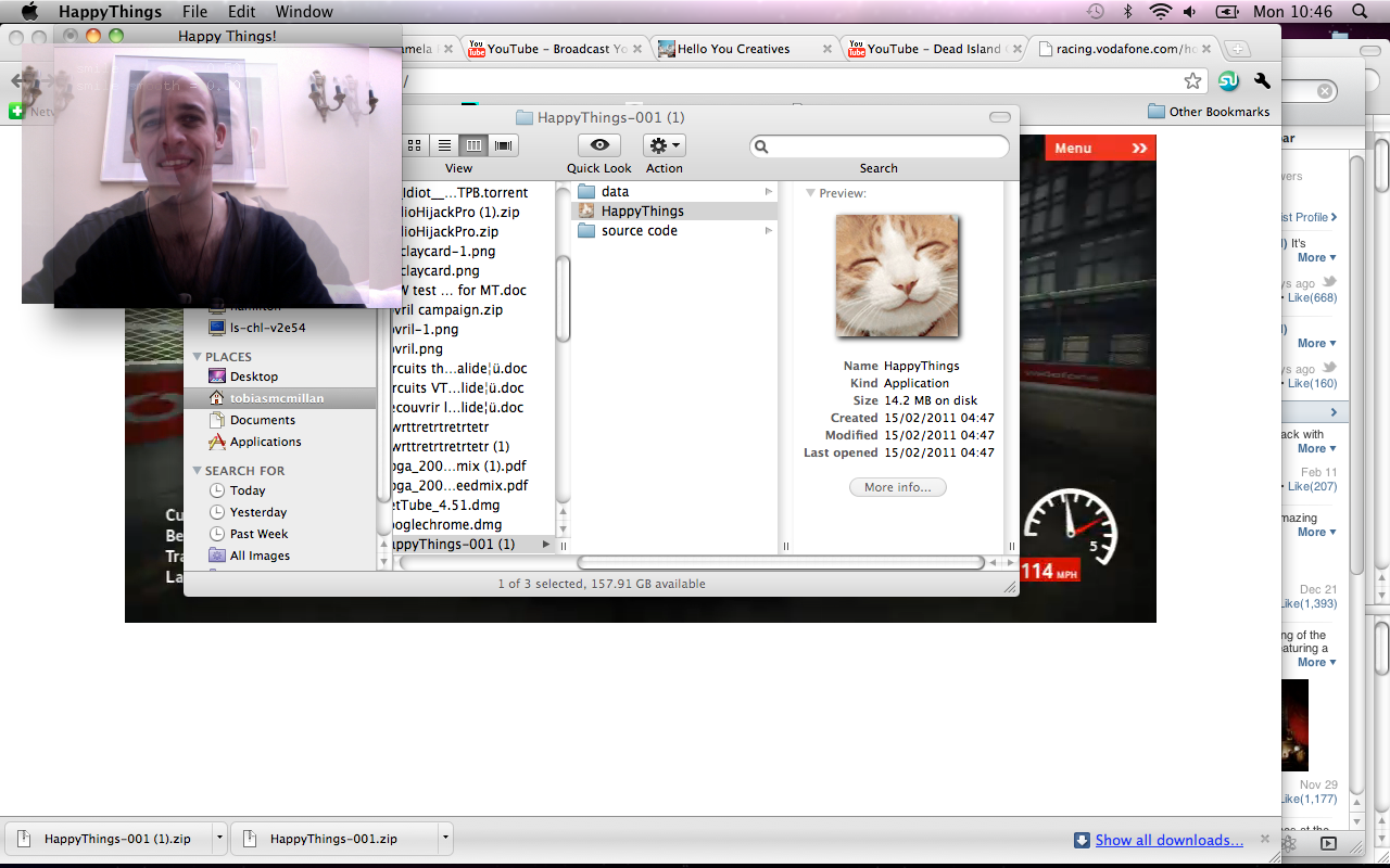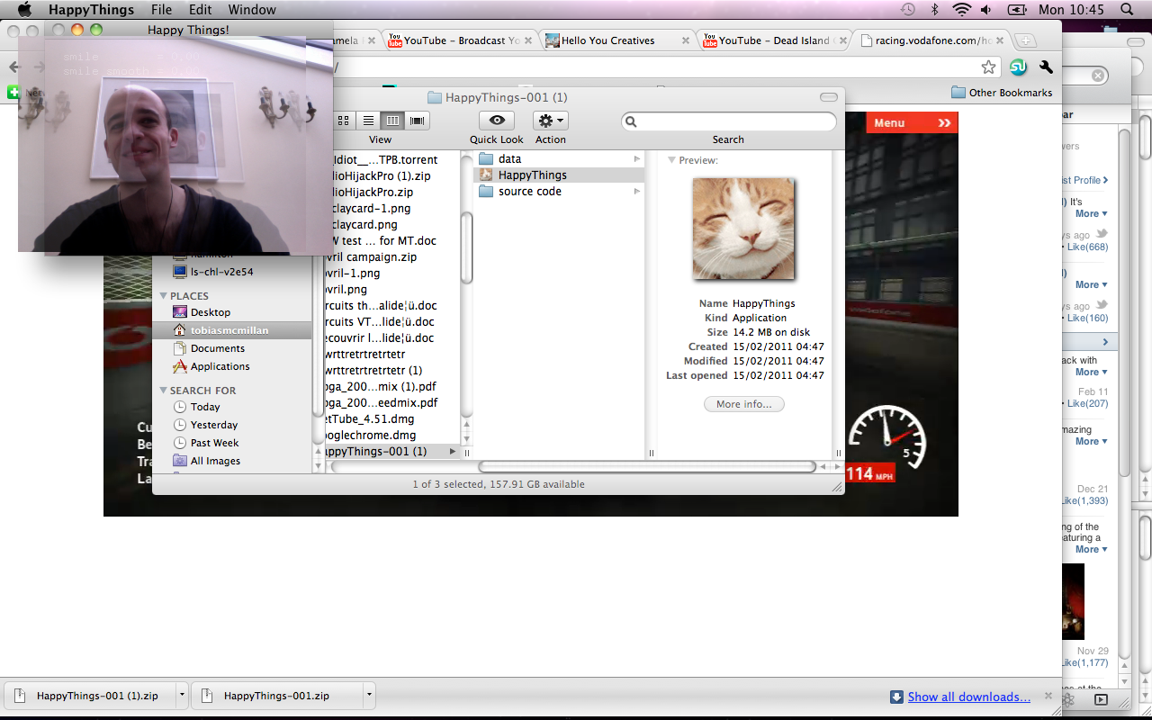 Happy Things is a one hour speed project by Theo Watson and Kyle McDonald that automatically posts a screenshot every time you smile. Download it here (OS X, 10 MB).