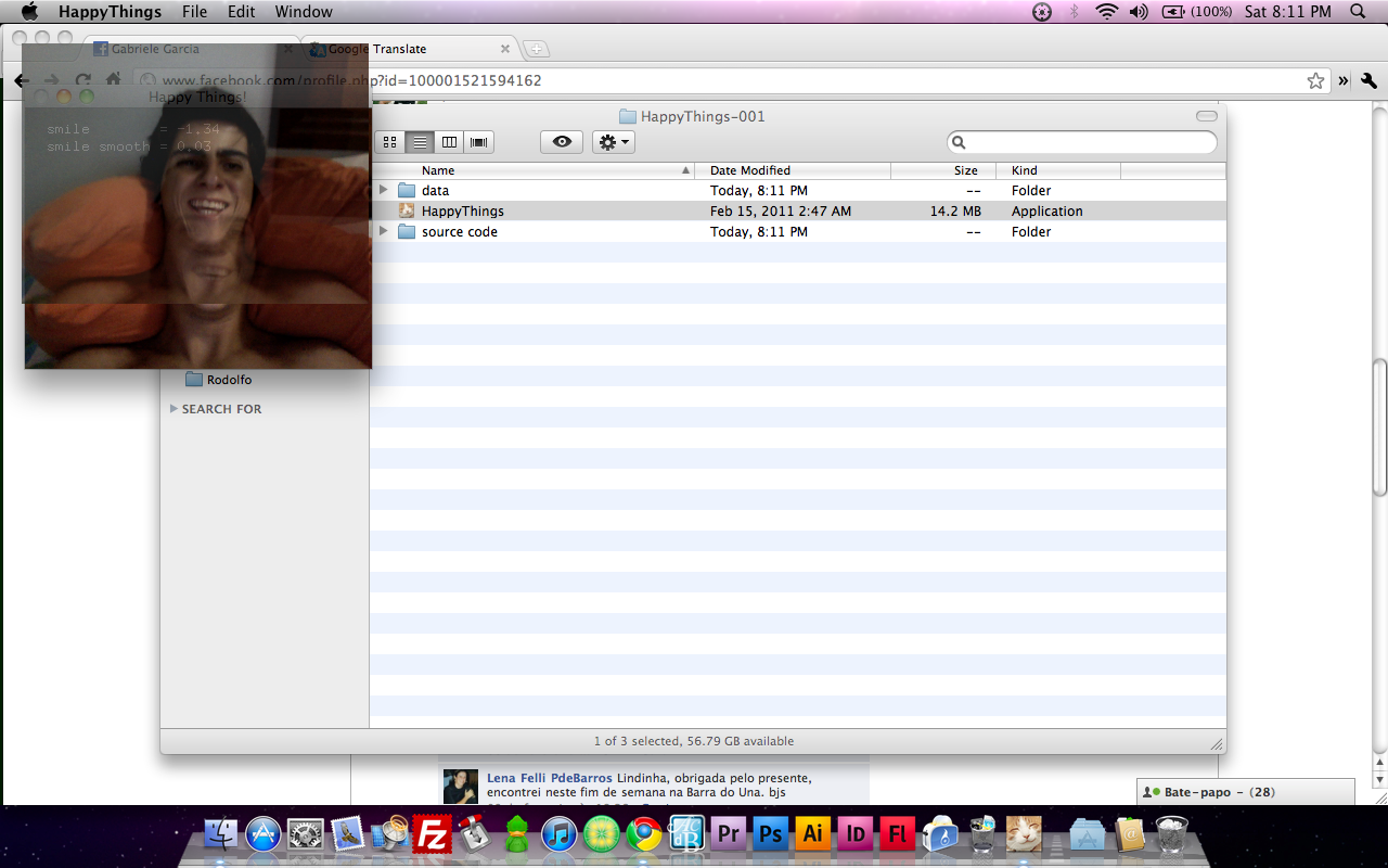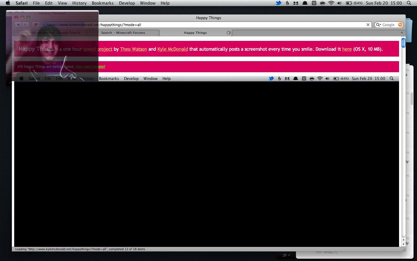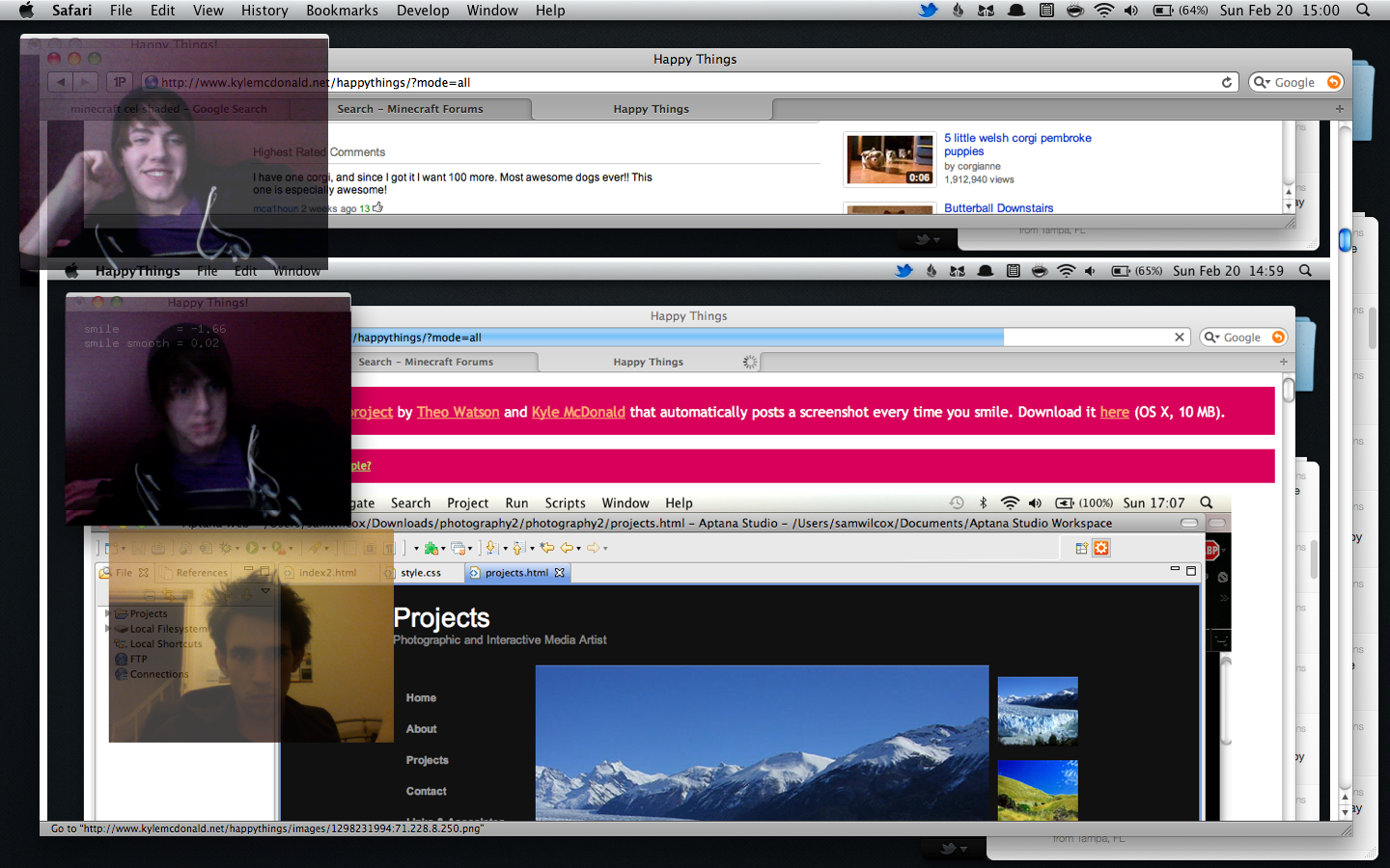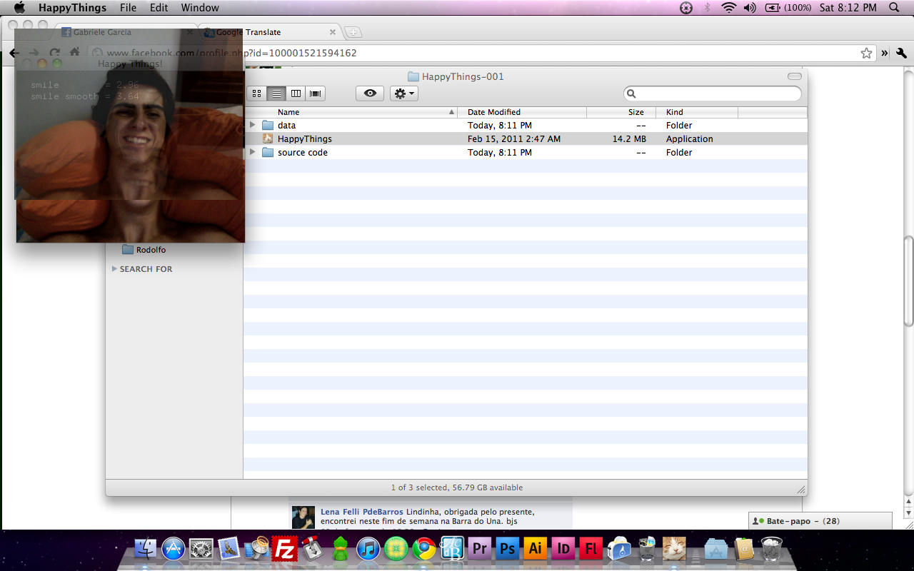 Happy Things is a one hour speed project by Theo Watson and Kyle McDonald that automatically posts a screenshot every time you smile. Download it here (OS X, 10 MB).