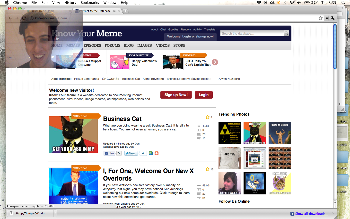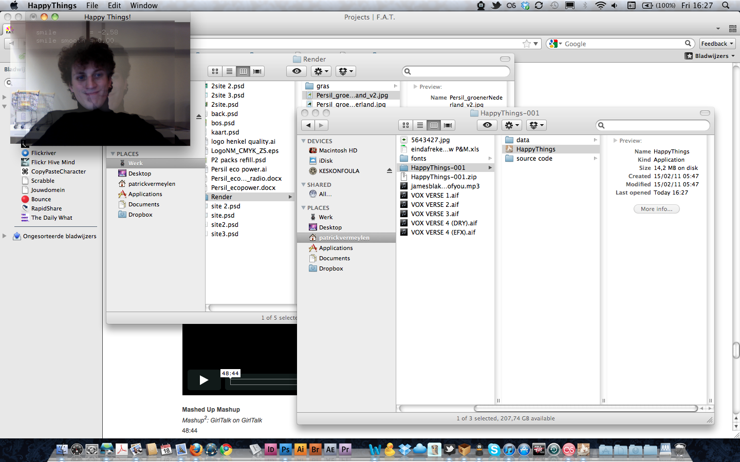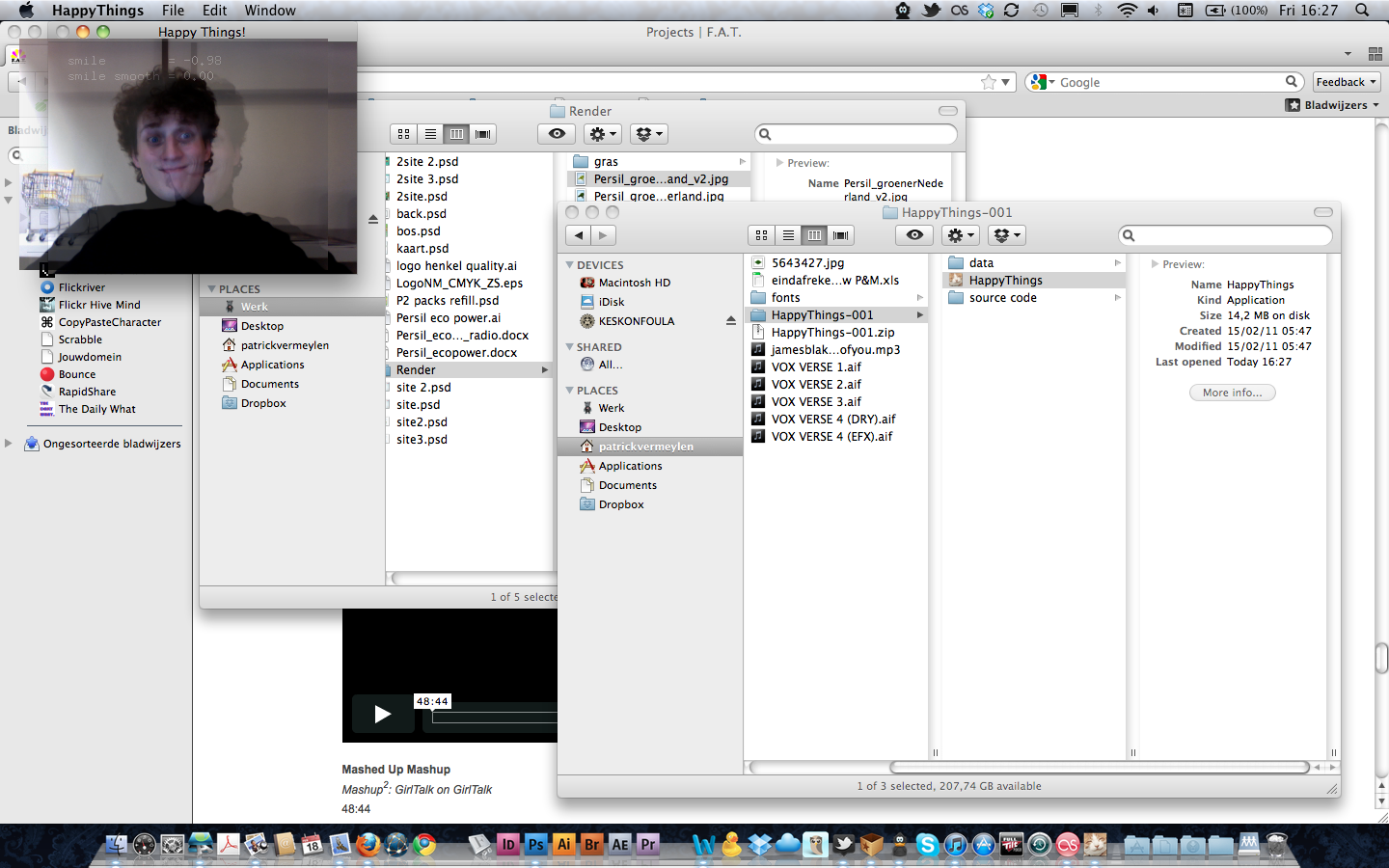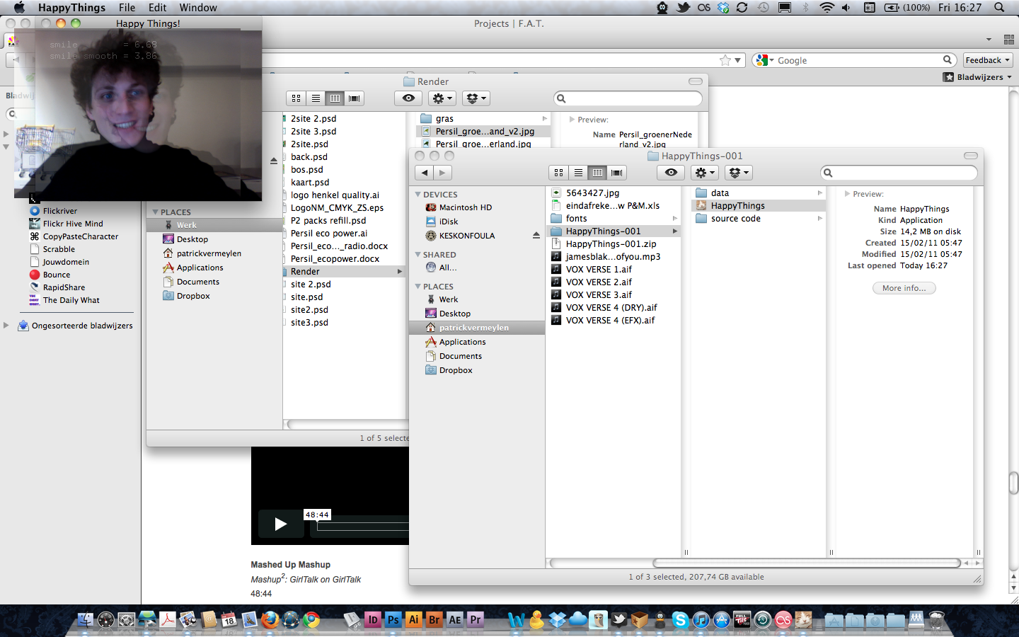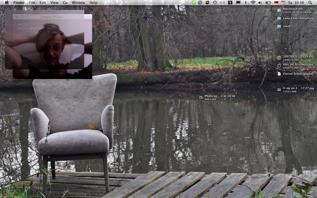 Happy Things is a one hour speed project by Theo Watson and Kyle McDonald that automatically posts a screenshot every time you smile. Download it here (OS X, 10 MB).
