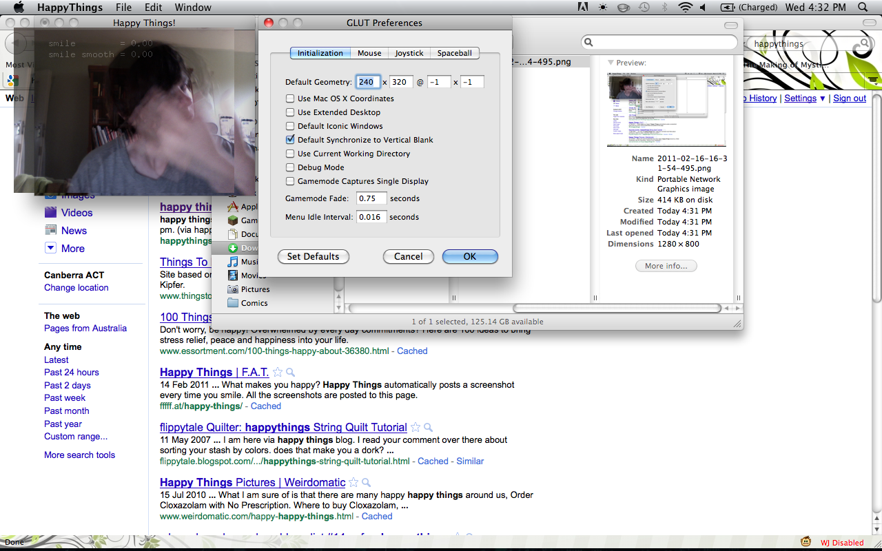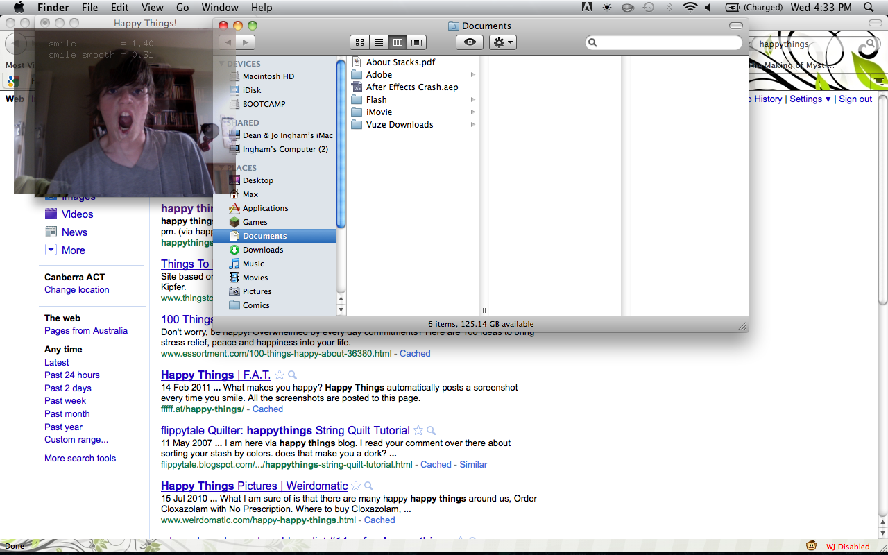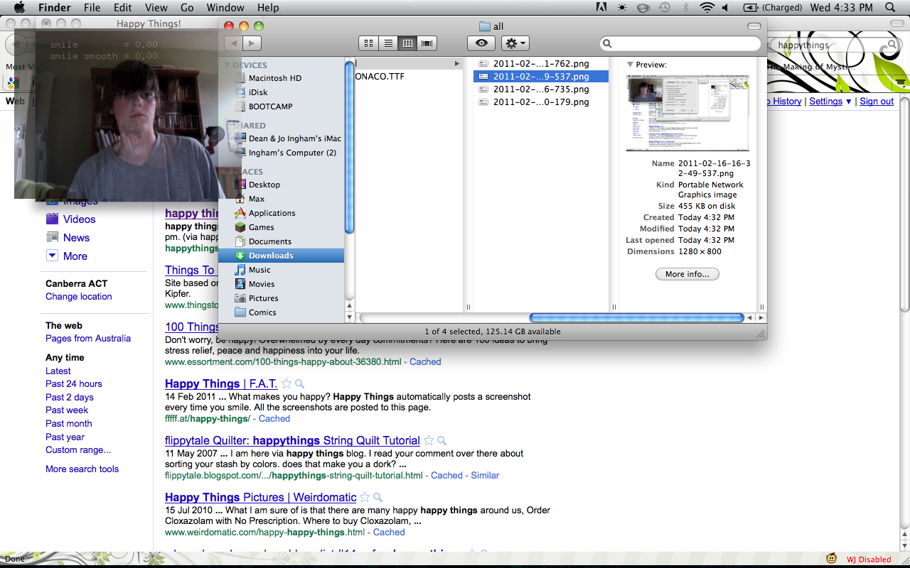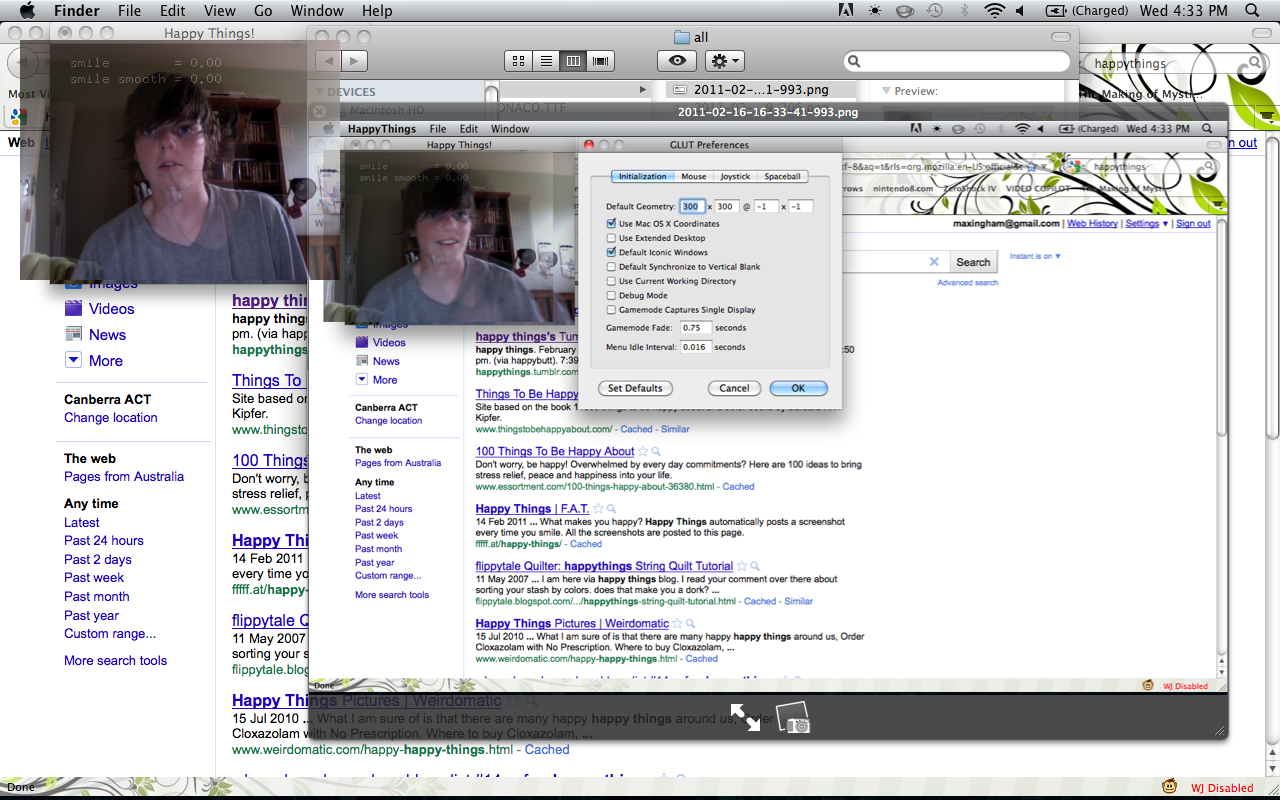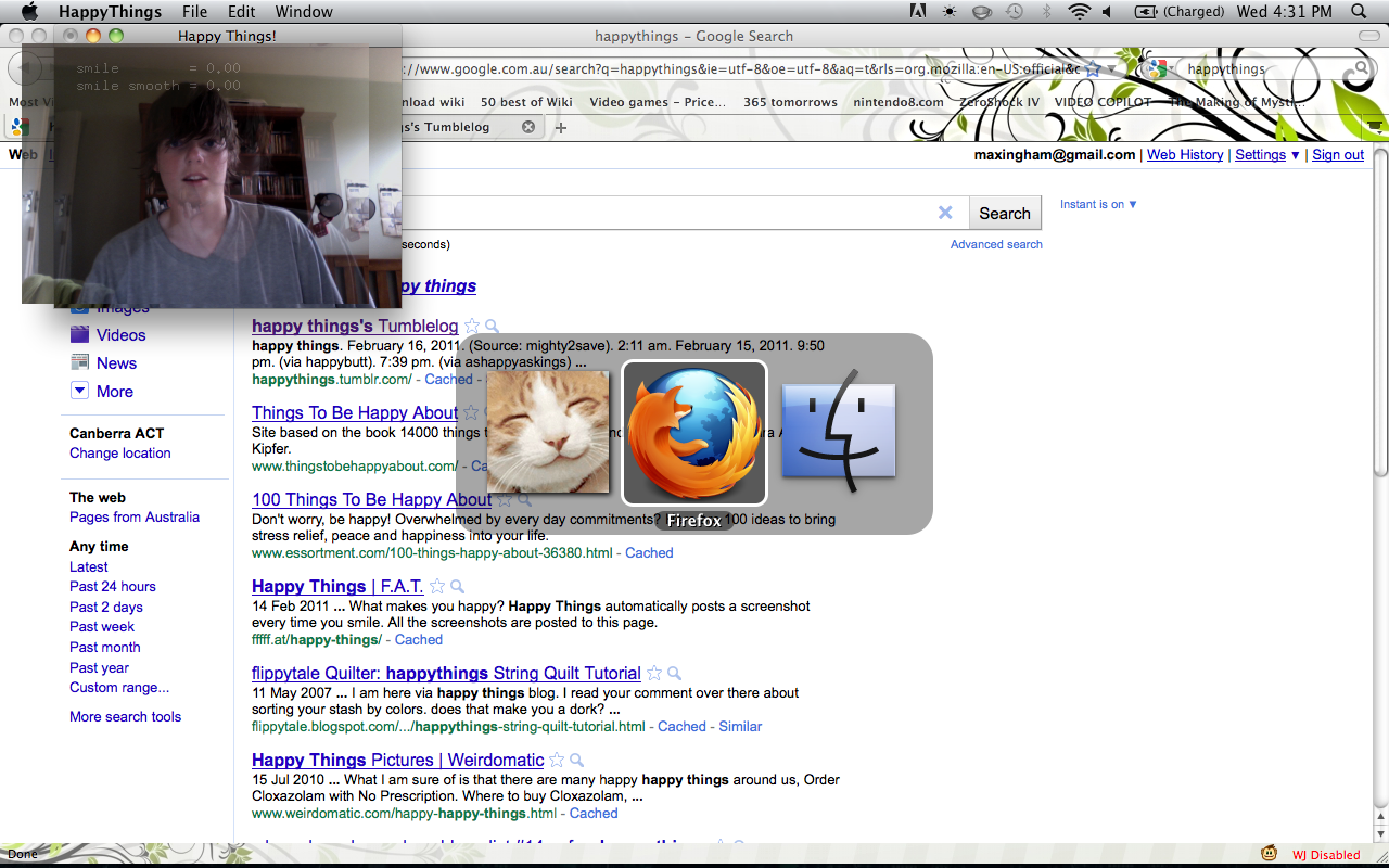 Happy Things is a one hour speed project by Theo Watson and Kyle McDonald that automatically posts a screenshot every time you smile. Download it here (OS X, 10 MB).