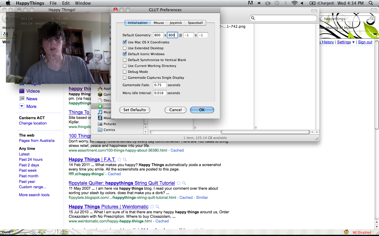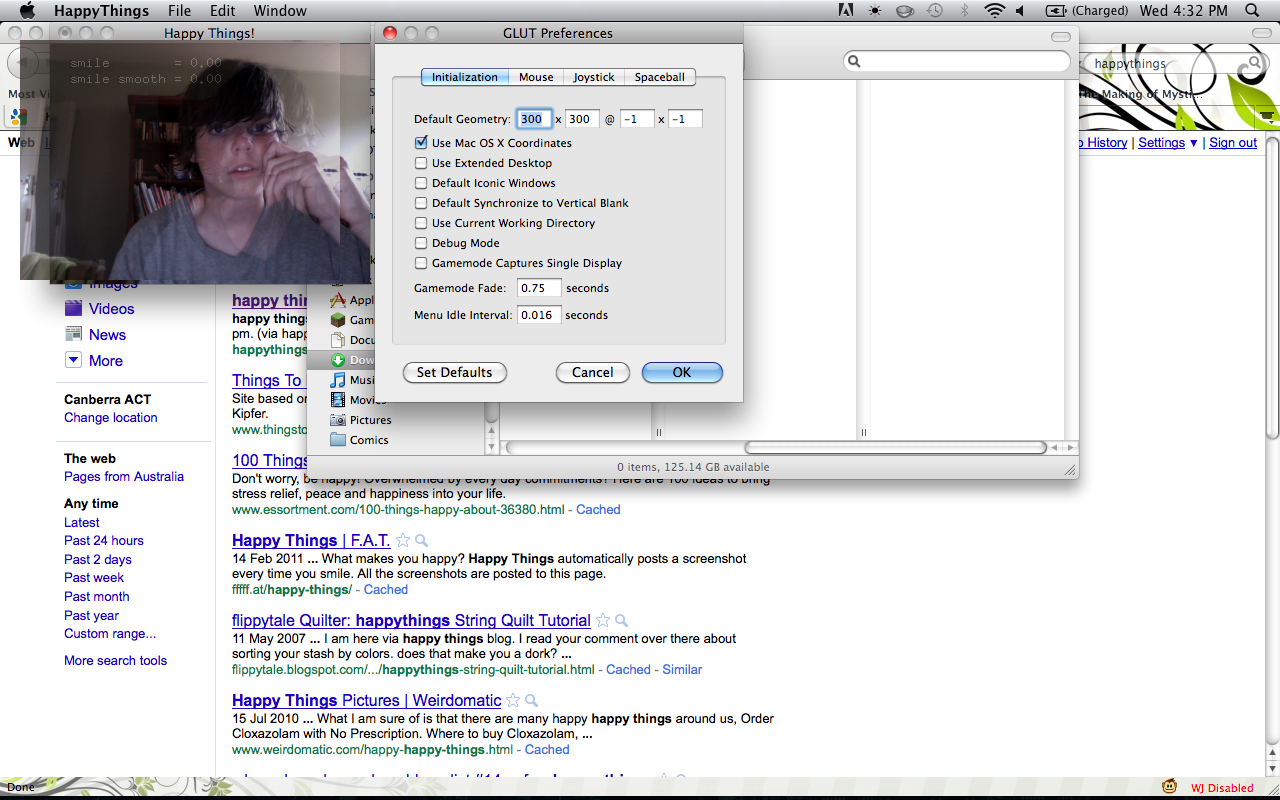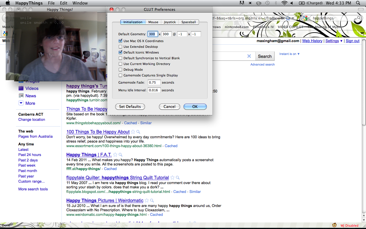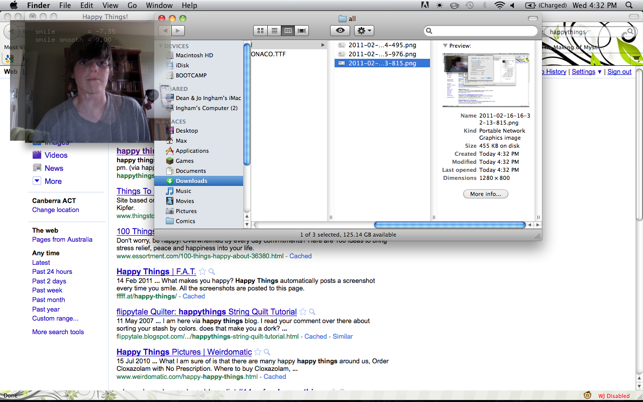 Happy Things is a one hour speed project by Theo Watson and Kyle McDonald that automatically posts a screenshot every time you smile. Download it here (OS X, 10 MB).