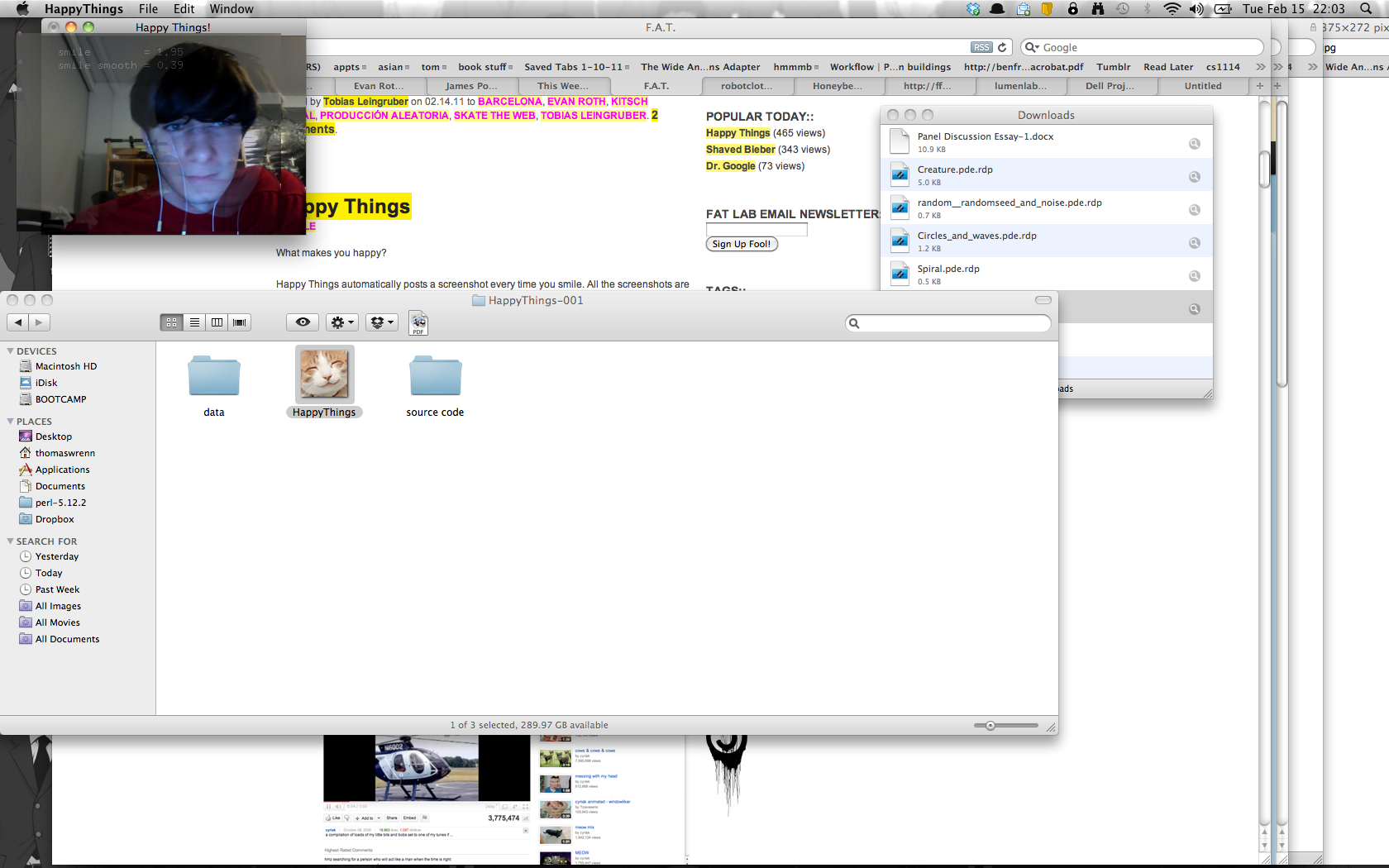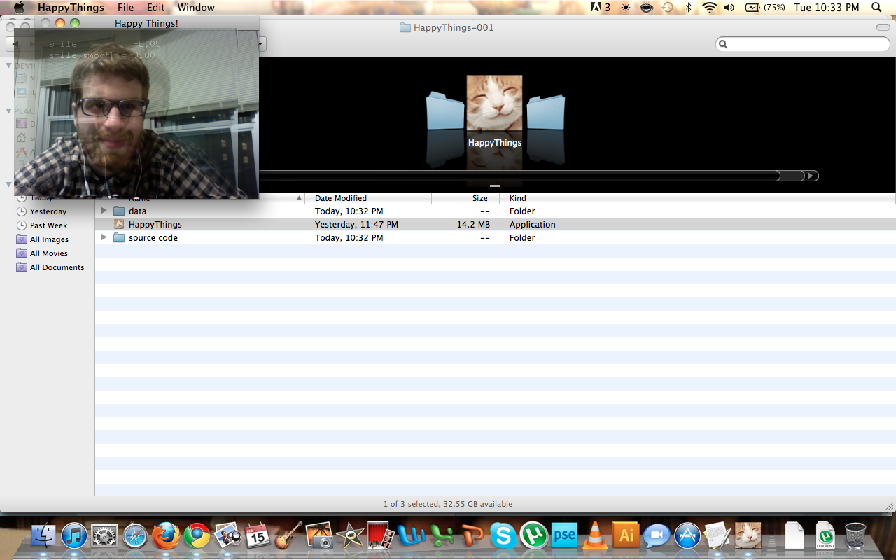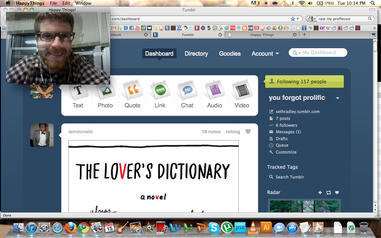 Happy Things is a one hour speed project by Theo Watson and Kyle McDonald that automatically posts a screenshot every time you smile. Download it here (OS X, 10 MB).