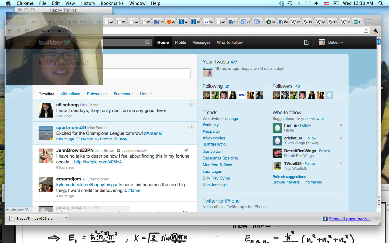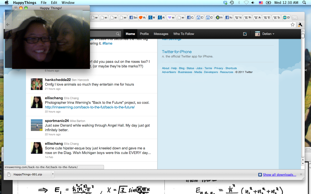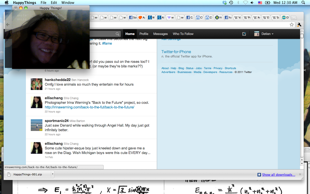 Happy Things is a one hour speed project by Theo Watson and Kyle McDonald that automatically posts a screenshot every time you smile. Download it here (OS X, 10 MB).