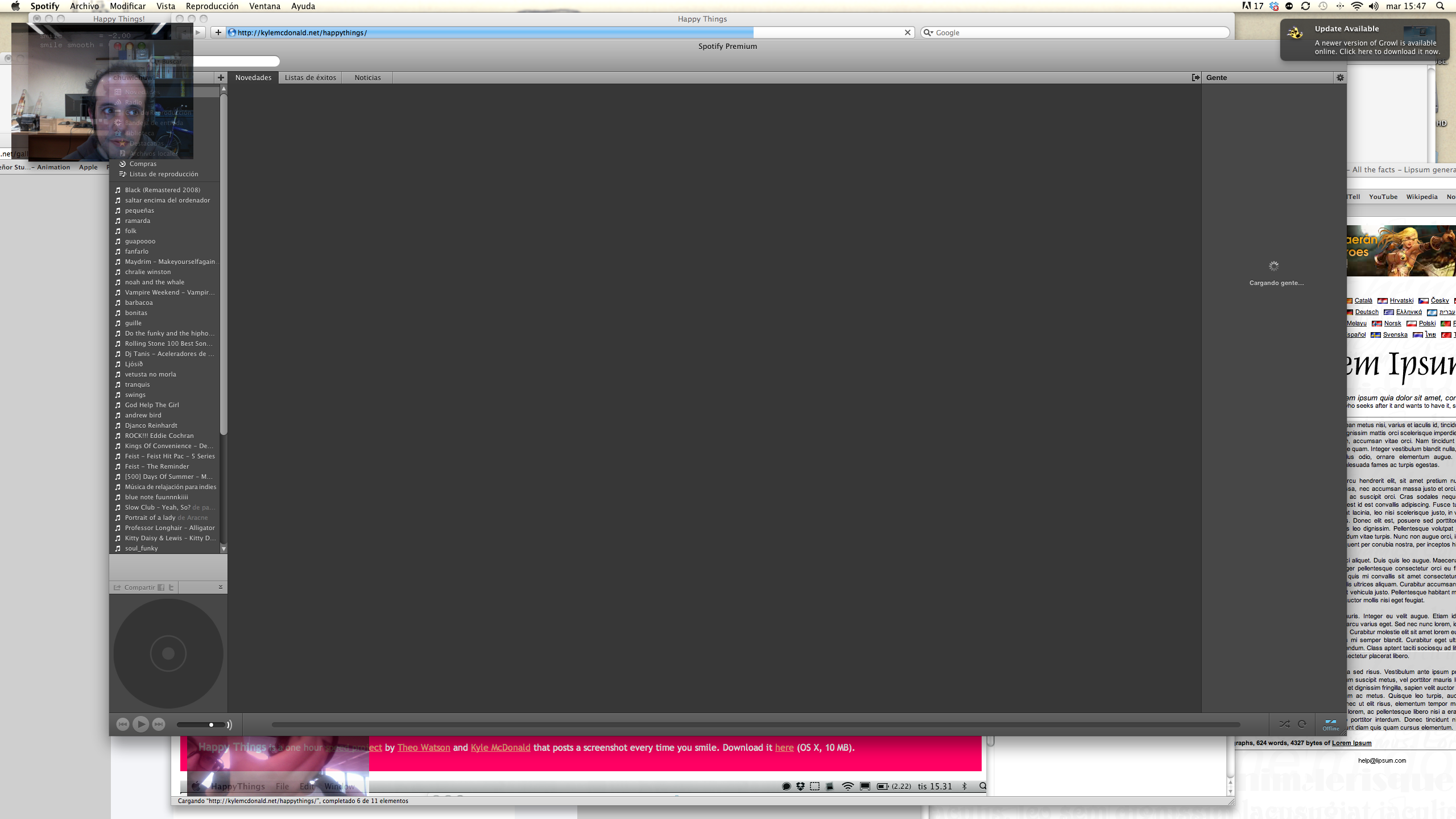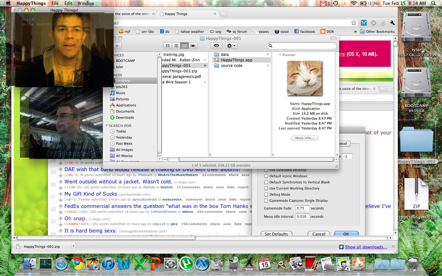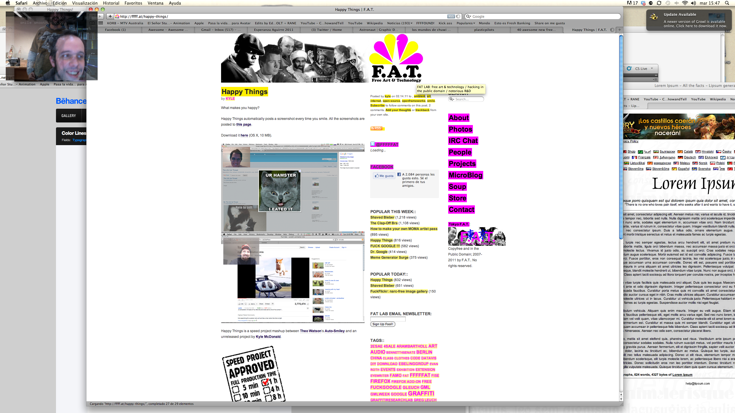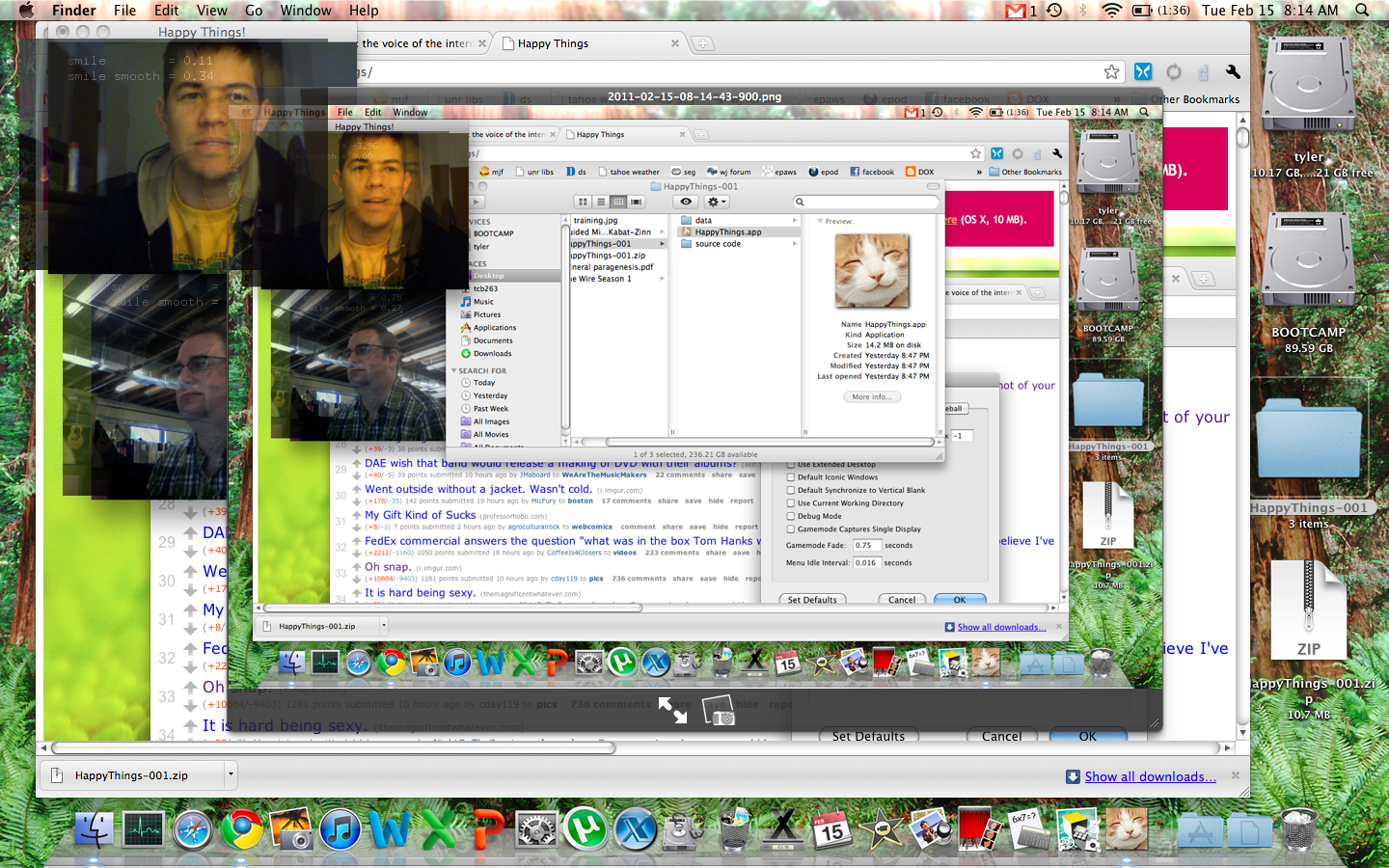 Happy Things is a one hour speed project by Theo Watson and Kyle McDonald that automatically posts a screenshot every time you smile. Download it here (OS X, 10 MB).