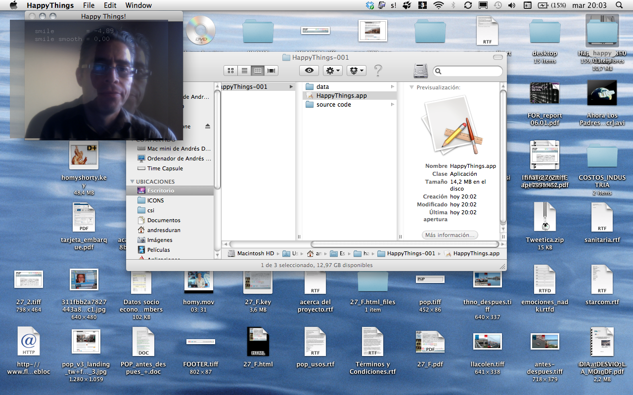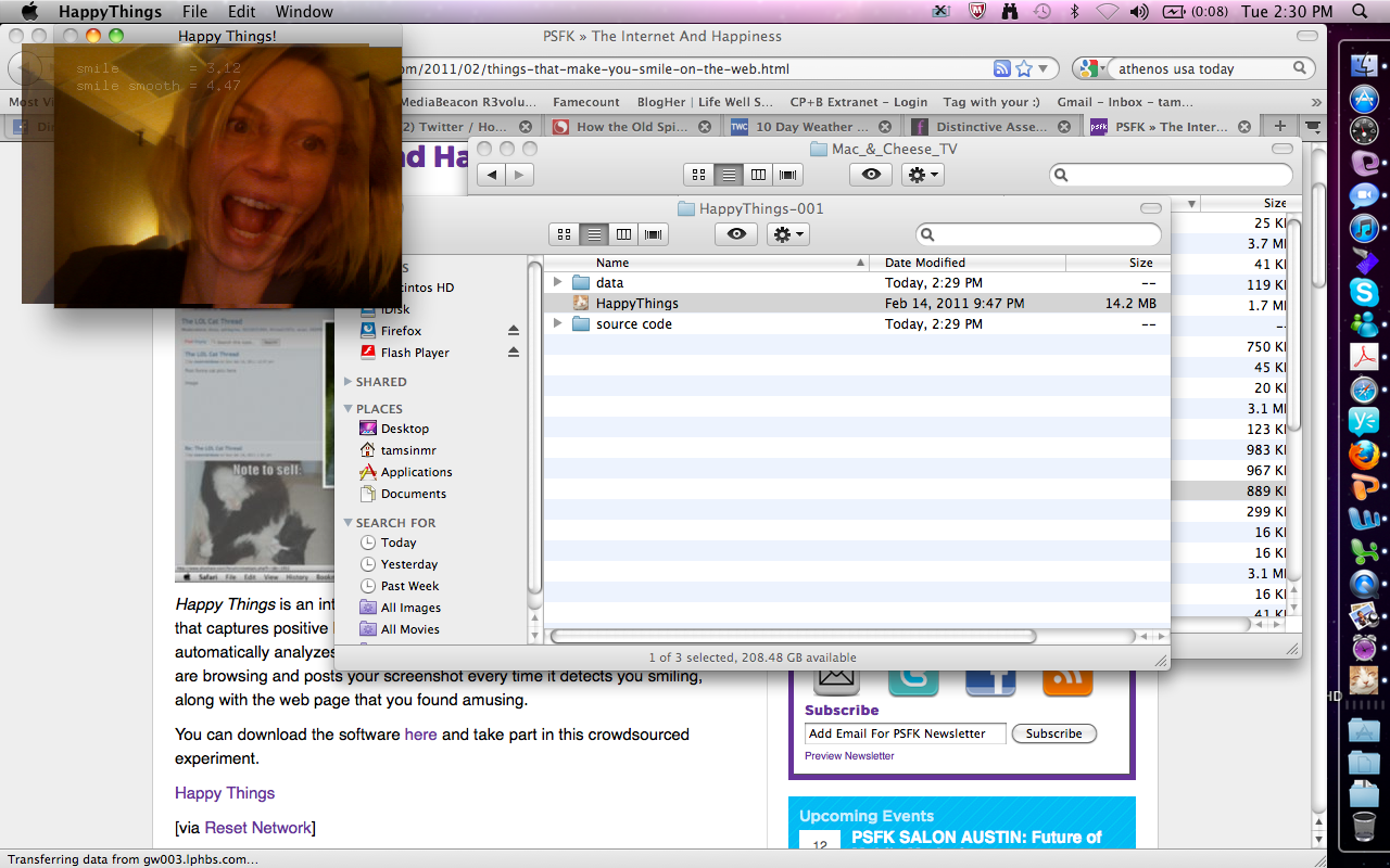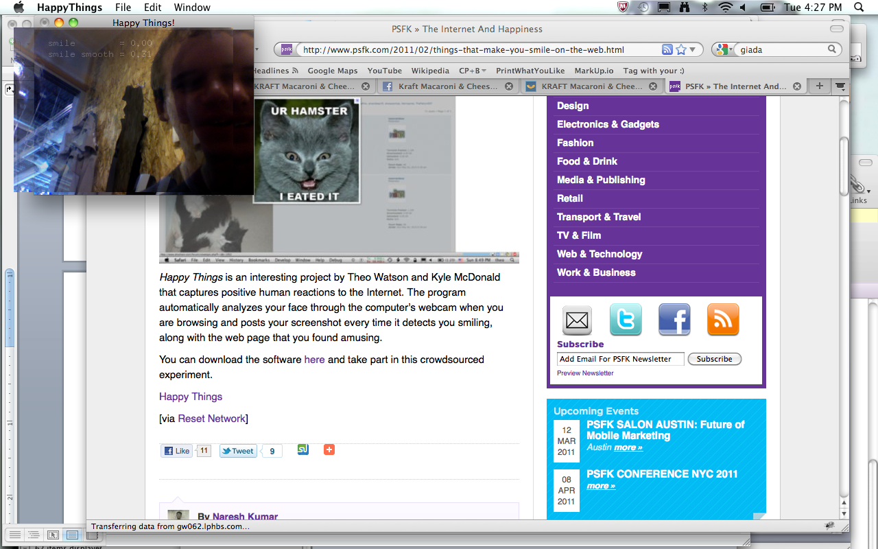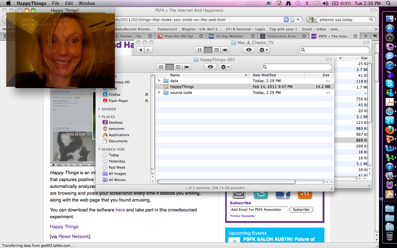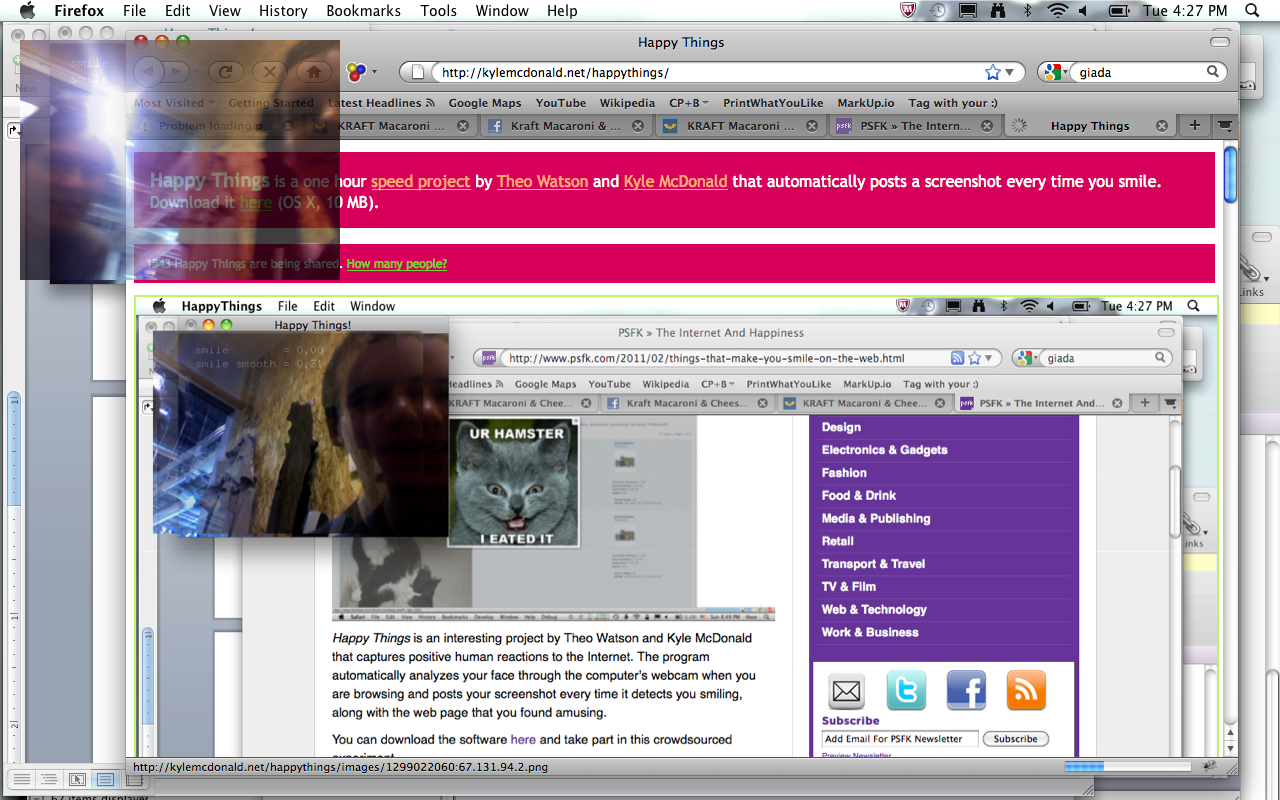 Happy Things is a one hour speed project by Theo Watson and Kyle McDonald that automatically posts a screenshot every time you smile. Download it here (OS X, 10 MB).